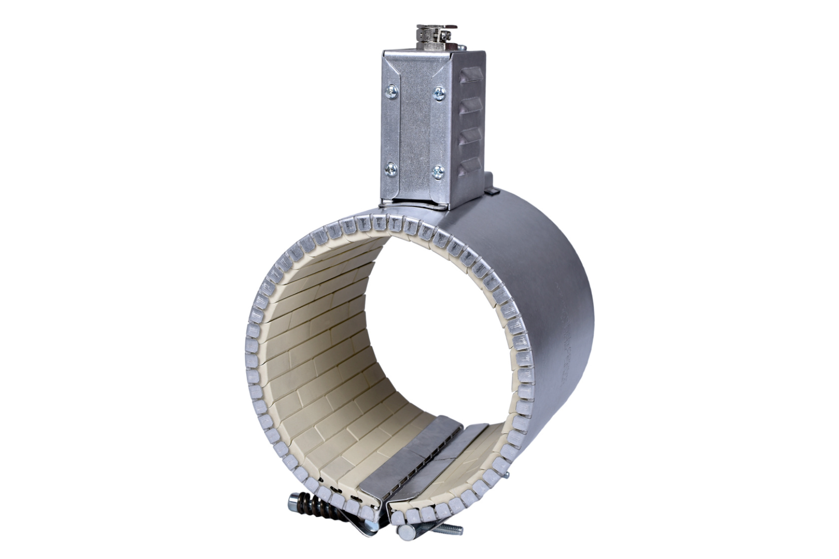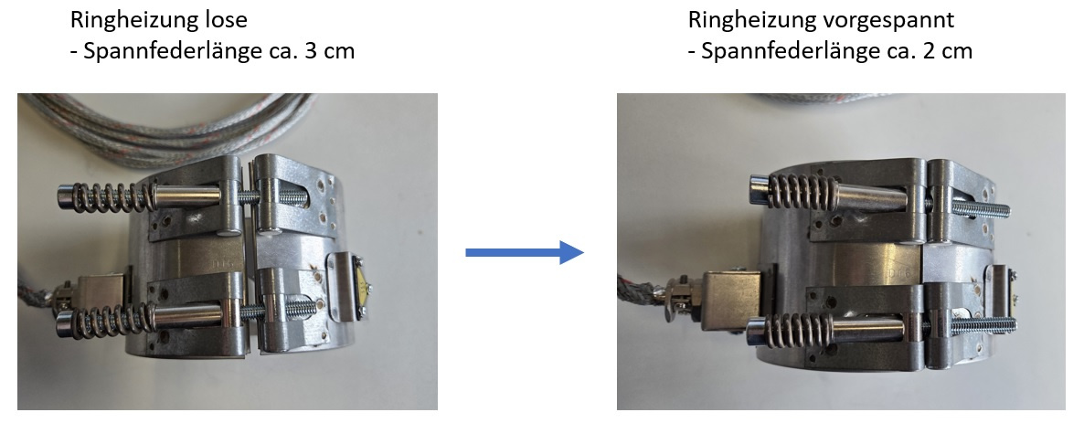 Das Heizelement muss formschlüssig auf den zu beheizenden Zylinder aufgespannt werden. Dabei ist Vorsicht walten zu lassen, um die Keramikglieder im Inneren des Heizelementes nicht zu beschädigen oder gar zu zerstören. Es wird ein Drehmoment empfohlen, welches gewährleistet, dass die Keramiksteine des Heizelementes optimal am Zylinder anliegen.
